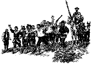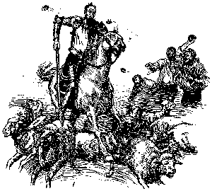 På vejen bort fra kroen beklager Sancho sig over hans fortrædeligheder, da pludselig Don Quijote får øje på nogle støvskyer på vejen. Han forestiller sig, at det er to store hære, som står overfor hinanden, klar til kamp, mens Sancho forsøger at fortælle sin herre, at støvet er rejst af to fåreflokke. Don Quijote afviser ham og kaster sig ind i slaget, og han har dræbt syv får, inden et par stenkast fra to hyrder har slået to af hans tænder ud. Sancho fortæller, at hærene faktisk bestod af får, men Don Quijote forklarer, at en troldmand midt under kampen forvandlede soldaterne til får for at aflede hans opmærksomhed. Don Quijote beder Sancho om at føre ham til den nærmeste kro. Sancho fortæller Don Quijote, at deres problemer skyldes, at Don Quijote har brudt sit løfte om at føre en korrekt livsstil, indtil han finder en ny hjelm. Don Quijote erklærer sig enig heri, men bebrejder Sancho ikke at have gjort ham opmærksom på det.