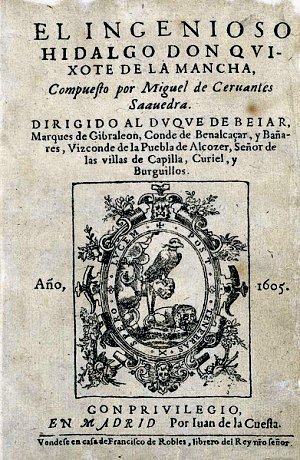 Forsiden af "El Ingenioso Hidalgo Don Quijote de la Mancha", udgivet i 1605.