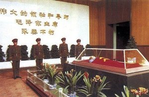 Køen bevægede sig rask fremad, og snart kom vi ind i den store forgård. Bo kunne høre, at de besøgene kom fra alle egne af Kina, og vi så faktisk kun ganske få vesterlændinge. Her lå en lille bod, hvor man kunne købe en gul blomst (tulipan?), indpakket i cellofan, hvilket mange benyttede sig af. Efter at have besteget den udvendige trappe kom vi ind i den såkaldte nordsal, hvor der var en stor marmorstatue af formanden, siddende i en hvid marmor lænestol (mindede mig lidt om Abraham Lincolns statue i Lincoln Memorial i Washington). Bag statuen var et kæmpemæssigt vægmaleri af et kinesisk landskab i kraftige farver. Mange kinesere faldt på knæ og hilste stærkt bevægede formanden og anbragte deres gule blomst foran hans fødder. (Jeg må indrømme, at jeg tænkte den tanke, om mon ikke de pænt indpakkede tulipaner blev solgt endnu en gang - men på den anden side - hvorfor egentlig ikke?). Vi blev delt i to strømme, som "flød" ind på hver sin side af den døde Mao i den store mindesal. Som nævnt var det ikke tilladt at medbringe kamera i mausoleet, så billedet ovenfor stammer fra en lille publikation, man kan købe ved indgangen. Ivrige vagter sørgede for, at menneskerækken hele tiden bevægede sig fremad. Bos teori herfor var, at man ikke ønskede, at tilskuerne skulle få for godt et billede af den døde formand, som efter ca 30 år formentlig indeholder mere voks end biologisk materiale. Jeg havde læst, at liget befandt sig i en glas- eller krystalkiste, men det gjorde han ikke den dag, vi var der. Når liget ikke ligger til beskuelse, befinder det sig i et fryserum i den bombesikre kælder, hvorfra det bringes op og ned af en elevator. På bagvæggen var indgraveret følgende sætning: "Evig pris til formand Mao, vores store leder og mester". I løbet af ganske kort tid havde vi passeret gennem bygningen og kom ud i den sydlige ende af mausoleet.