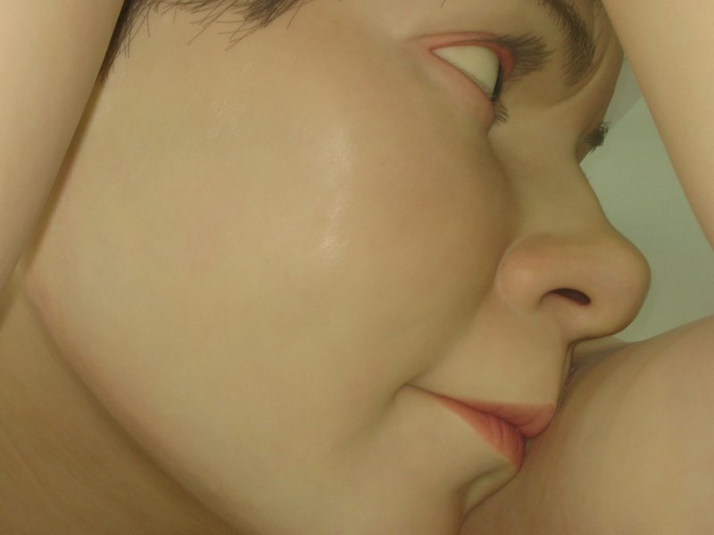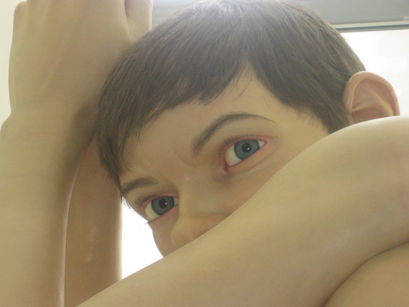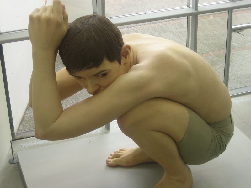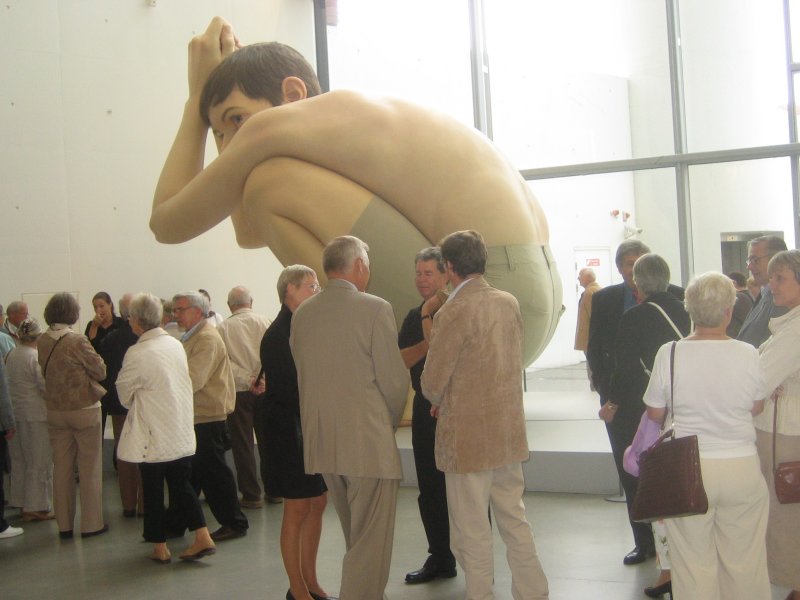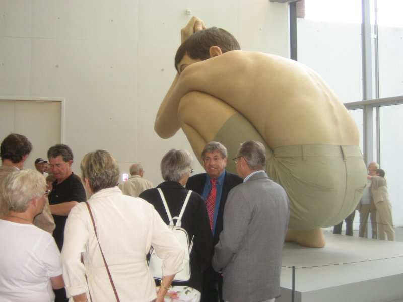 I kælderetagen så vi den australske kunstner Ron Muecks kæmpeskulptur, "Boy", som er ARoS' vartegn. Den fem meter høje dreng sidder på hug og stirrer ud i horisonten. Denne position er efter sigende inspireret af de australske aboriginals, der vagtsomt skuer ud over sletten efter bytte. "Boy" er skabt i glasfiber, mens hans hår, øjenvipper og –bryn er lavet af fiskesnøre. Ron Muecks hustru har selv syet shorts til "Boy". Ja, der står som bekendt kvinder bag alt.