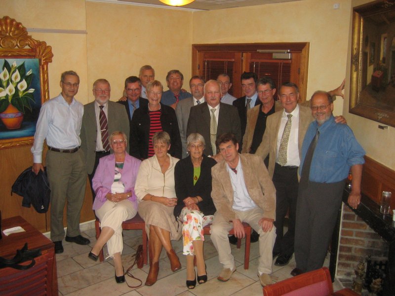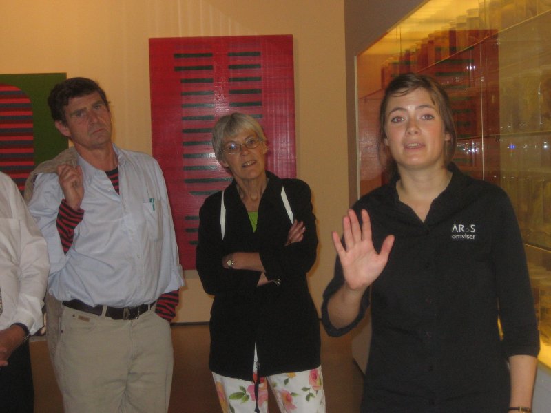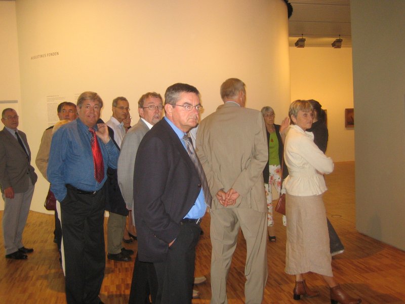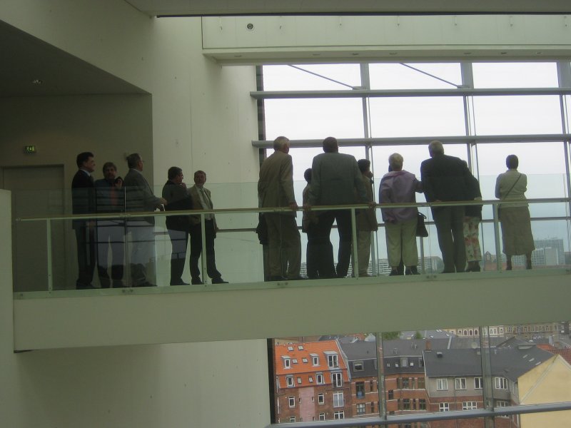 Fra kl 13:30 begyndte folk at dukke op. De fleste kunne med lidt besvær/hjælp genkende hinanden. Det er dog også kun fem år siden, vi sidst var samlet, men jeg lagde mærke til, at der var flere, der var kommet til at se lidt gamle ud, men vi ældes jo ikke alle lige yndefuldt. Der var desværre nogle, som havde valgt at tage på arbejde (Birthe Falkenberg og Birgitte West) i stedet for at være sammen med os gamle skolekammerater. Hanne Vestergaard havde foretrukket at køre rundt i Extremadura i Spanien i uudholdelig hede - sammen med sin mand!. Mogens Nielsen var taget sydpå sammen med sin hustru Elin. Andre igen(Karl Gustav, Karin Højgaard og Liselotte) havde valgt at gå til fest med familien. Birgit Fleischer, som bor i USA, og Arne Graae, som nyder sit otium (nej, ikke opium) som landmand med EU-tilskud i Frankrig, havde sendt hilsener til alle. Karin og Liselotte dukkede op på ARoS for at tilbringe et par timer med os. Tak for det! Louis Rolander, som et par dage senere kunne fejre 25 års jubilæum i Århus Amtsråd, ville først slutte sig til os om aftenen.