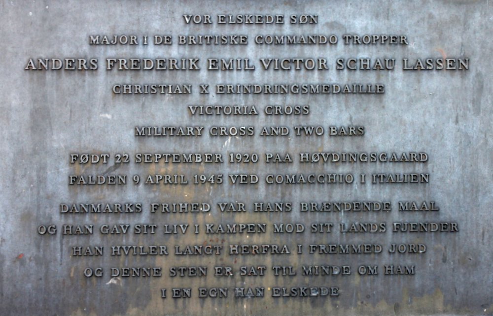 Det britiske krigsministerium begrundede indstillingen af Anders Lassen til victoriakorset således: "Major A.F.E.V.S. Lassen blev beordret til at føre en kamppatrulje under angrebet på den nordlige bred af Lago Comacchio, Italien, natten mellem den 8.-9. april 1945. Hans opgaver var at skabe forvirring og forvolde tab blandt fjenden, tage fanger samt give det indtryk af, at hovedlandgang var under anmarch. Ved sin strålende ledelse og sin fuldstændige foragt for sin personlige sikkerhed havde major Lassen, stillet ansigt til ansigt med overvældende overlegne styrker, nået sit mål. Tre fjendtlige stillinger blev udslettet, inklusive seks maskingeværer, otte fjender blev dræbt og andre såret, og der blev taget to fanger. Den høje grad af pligttroskab og den agtelse, hvormed han blev betragtet af de mænd, som han anførte, og sin enestående tapperhed, satte major Lassen i stand til at udføte alle de opgaver, han havde fået overdraget, med fuldstændig succes." Ovenstående er et uddrag, men hvis du vil læse hele indstillingen, så klik her.