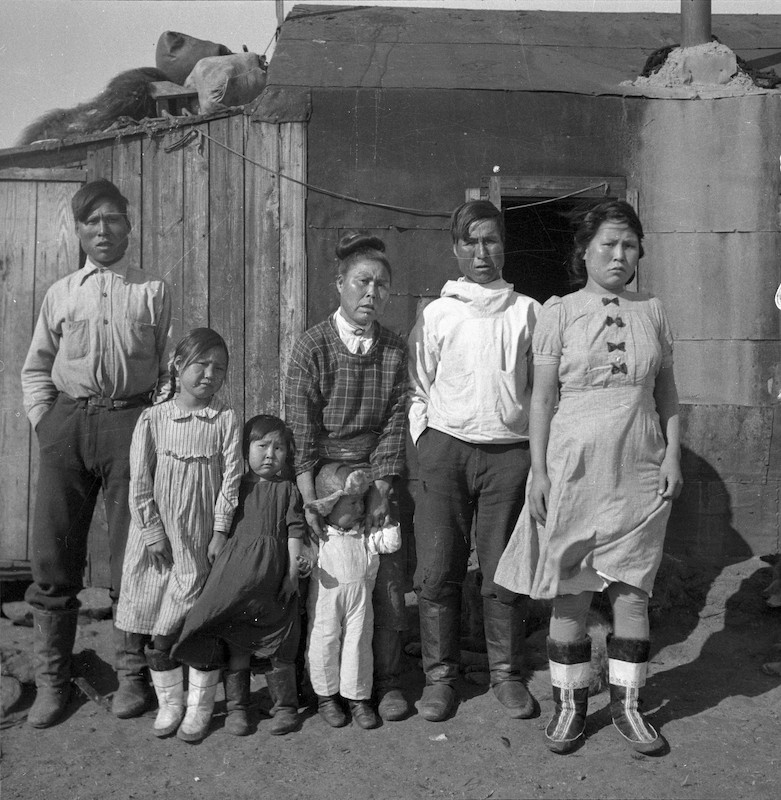 En fangerfamilie udenfor hus ved Scoresbysund, 1924 (Arktisk Institut)