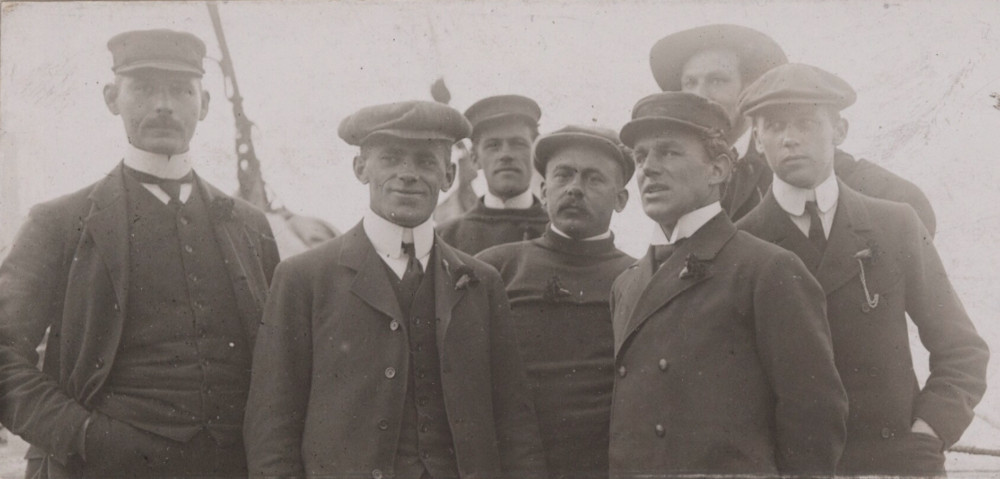 Fra venstre: premierløjtnant i infanteriet Christian Herman Jørgensen (1873-1962), kaptajn Ejnar Mikkelsen (1880-1971), sømand Hans P. Olsen, maskinist Georg Aagaard Poulsen, tømrer Carl Unger, næstkommanderende og premierløjtnant i søværnet Wilhelm H. Laub (1887-1945)