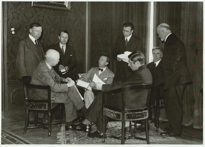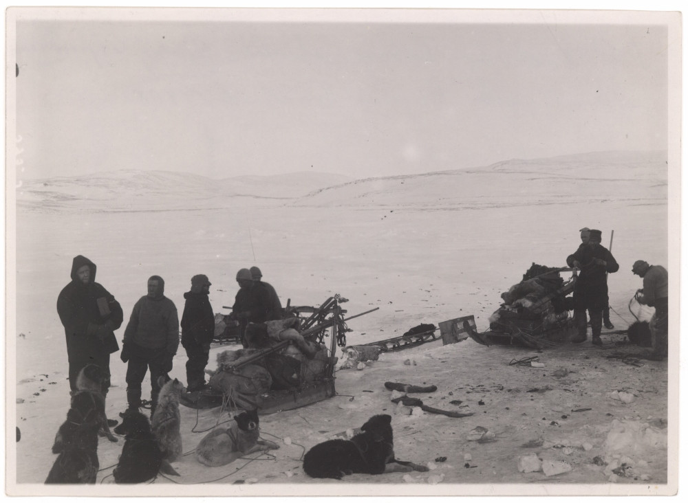 Delegationens medlemmer: landsdommer N.V. Boeg, gesandt og kammerherre H.A. Bernhoft, gesandt Helge Wamberg, udenrigsminister Gustav Rasmussen, polarforsker Lauge Koch, polarforsker Knud Rasmussen, polarforsker Ejnar Mikkelsen, søofficer G.C. Amdrup. Det Kgl. Biblioteks billedsamling.