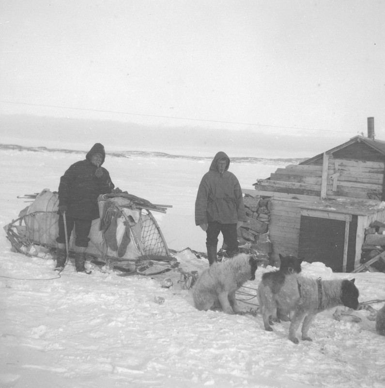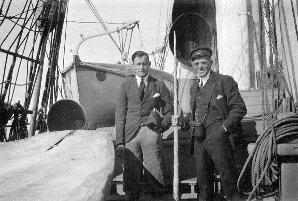 Ebbe Munck og Ejnar Mikkelsen på "Pourquoi-Pas?". Mikkelsen står med en narhvalstand, som har havde fået af taknemlige eskimoer, fordi han havde åbnet Scoresbysund for dem. Billedet er fra Arktisk Instituts samling.