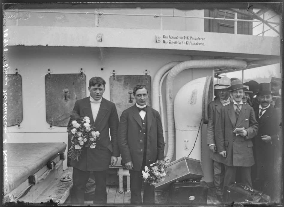 På fotoet til højre ses Mikkelsen og Iversen ved deres ankomst til Aalesund, Norge, den 27. juli 1912.
