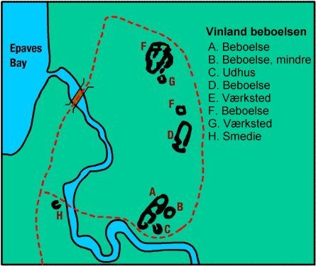 Beboelsen består af 3 komplekser, hvert bestående af et beboelseshus og et værksted. Husene har en størrelse på ca. 4 x 3.5 meter. Smedene holdt til i husene A, B og C. Jern blev udvundet af myremalm i hus B [eskimoer og indianere havde ikke kendskab til jernudvinding] og opbevaret i et værelse i hus A indtil anvendelse til smedning. D-E komplekset husede en tømrer. I F-G komplekset blev der udført reparation af skibe, og arkæologerne fandt mange nagler, som var blevet udskiftet. Ved smedjen H , som ligger på den anden side af bækken, blev fundet slagger og små jernfragmenter. I den nordlige ende fandt man i en skråning en grube, som var 70 cm dyb, 2.3 m lang og 1.1 m bred. Der blev fundet endnu af disse gruber. På bunden af gruberne fandt man sod og trækul samt et stort antal strandsten, der tydeligt havde ligget i ilden. Sådanne kogegruber var også kendt fra større nordiske husholdninger på Grønland. En kulstof 14-datering af ildstedet angav år 1030 +/- 70 år. Der er foretaget i alt 12 kulstof-14 dateringer fra området. De giver alle resultater omkring år 1000. Den seneste datering giver år 1080 +/- 70 år.