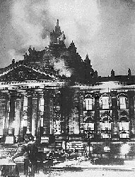 Den 27. februar 1933 brød en mentalt forstyrret kommunist, hollænderen Marinus van der Lubbe ind i rigsdagsbygningen og satte ild med en fakkel. Han havde åbenlyst talt om at sætte ild til offentlige bygninger i Berlin for at starte en kommunistisk revolution. Det har været nævnt, at handlingen var inspireret af Göring og Goebbels for at skabe panik i befolkningen, men det er (mig bekendt) ikke bevist. Detaljerne er lidt uklare, men det menes, at nazistiske SA-folk under ledelse af Göring hjalp til ved brandstiftelsen. Hitler og Goebbels dukkede hurtigt op på stedet, hvor Göring fortalte, at van der Lubbe var anholdt for brandstiftelsen. (Han blev senere dømt til døden og halshugget).