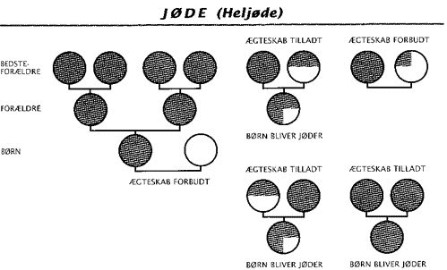 Nedenstående overskuelige diagrammer, som jeg har hentet fra vores førende naziforsker, Karl Christian Lammers "Vejen til Auschwitz", Gyldendal, 2000, viser systemets absurditet. Det menes, at selv de tyske bureaukrater kunne have problemer med at finde ud af, hvem der var jøde - og i givet fald hvor meget jøde?