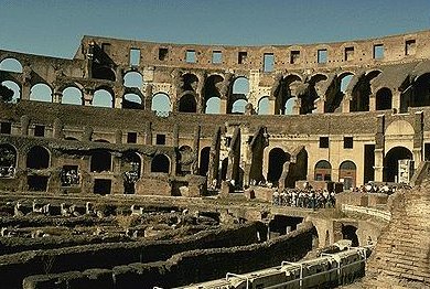 Romerne byggede amfiteatre til underholdning. Gladiator kampe og kampe med og mellem vilde dyr var nogle af de begivenheder, der udspandt sig i arenaen. Den jævne romer havde typisk én arbejdsdag og én fridag. Ja, mange af dem arbejdede slet ikke. En kalender fra antikken viser, at der på et år var 182 fridage!!! Hertil kom de ekstra fridage, som kejseren delte ud med rund hånd. Hvorledes de fik det nødvendigt arbejde udført? Det havde de slaver til. Og slaverne var jo ikke romere. For at undgå oprør måtte kejseren underholde masserne. Kejser Vespasian byggede (eller rettere fik bygget) amfitheatret i år 72 efter vor tidsregning på et område, som tidligere var en sump. Nogle af afvandingssystemerne og kloakerne fra den tid er stadig i funktion. Placeringen af colosseum var en politisk genistreg, idet Vespasian lod det bygge på det område, hvor den forhadte kejser Nero havde sit store fiskebassin. Nero havde 'eksproprieret' et stort område i det centrale Rom, hvor han lod bygge et prægtigt palads. (Resterne af Neros villa kan vistnok beses, men det fandt vi først ud af, da vi var kommet hjem). Området blev ryddet og Colosseum rejst. Da det var færdigt, kunne det rumme 75,000 tilskuere. Indretningen var meget praktisk med 8 nummererede indgange, hver med trapper, som førte op til de respektive platforme. Tilskueren kom ind ad sin bestemte indgang og kunne indtage sin plads på mindre end 10 minutter. Pladsen var bestemt af tilskuerens sociale status. Jo mere velhavende du var, jo tættere kom du til kejseren.De forskellige sociale klasser var således fuldstændig adskilt. Slaverne fik undertiden tilladelse til at stå høj, højt oppe og overvære de drabelige begivenheder på afstand. Ved indvielsen i år 80 deklarerede kejseren 3 måneders ekstra ferie. Og der blev uddelt enten penge eller fødevarer til befolkningen.