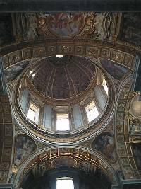 På vejen tilbage - ca 5 minutters gang fra Hotel Kennedy - 'opdagede' vi en fantastisk kirke. Lige ved siden af Via Cavour, en gade som vi besteg mange gange i løbet af vores ophold. Santa Maria Maggiore - én af Roms ældste basilikaer - er ifølge den såkaldte snelegende. I 352 besluttede et ældre velhavende ægtepar, at de ville give alle deres ejendomme til Jomfru Maria, og de bad hende om anvisning på, hvorledes hun ønskede pengene brugt. Om natten fortalte Jomfru Maria dem i drømme om at bygge en kirke, hvor der faldt sne i løbet af natten. Om morgenen den 5. august (august er almindeligvis årets varmeste måned) fik de meddelelse om, at det havde sneet på Esquiline højen. Ægteparret gik til pave Liberius, og han gik i gang med at bygge basilikaen (lad os håbe, at han ikke var helt alene om det). Hvert år den 5. august fejres Snemiraklet med et særlig messe, hvor tusindvis af kronblade kastes ud fra tagene for at skabe en illusion om sne. Kommer du til Rom på den tid, så er det sikkert en messe værd. Indtil det 14. århundrede fejredes hændelsen alene i Santa Maria Maggiore, men nu sker det vistnok i de fleste af (alle?) byens kirker. Kirken har 2 kupler og 2 indgange. Begge er så smukke, at man ikke kan tale om for- og bagside.
