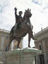 Midt på den stjerneformede marmorbelægning har i mange år stået en rytterstatue i bronce af kejser Marcus Aurelius. Der knytter sig en sjov historie til denne statue, som i mange hundrede år havde stået foran domkirken Giovanni in Laterano, idet man troede, at statuen forestillede kejser Konstatin den Store, som dels tillod kristendommen i Rom, dels selv konverterede til denne religion. Pga. luftforurening blev statuen taget ned for restaurering, og for et par år siden blev der opsat en kopi. Originalen befinder sig bag glas i Palazzo Nuovo. Omkring den smukke plads ligger adskillige nyere bygninger: Museo Capitolino (byens vigtigste museum for kunst og klassisk arkæologi), Palazzo Nuevo og Palazzo Conservatori (byens rådhus). Ved siden af trapperne (også udformet af Michelangelo), som fører op til pladsen fra Via del Teatro Marcello, står statuer af tvillingerne Castor og Pollux - som altid afbildet med deres elskede heste. Når de sejrende kejsere gik op på Capitol for at ofre til guderne, gik der bag ved dem en slave, som uafladeligt hviskede: "Husk på, du er kun et menneske". Måske glemte man at forsyne Mussolini med en sådan? Vi sneg os med ind til en bryllupsceremoni i et kapel. Efter vielsen klappede brudgommens venner voldsomt og råbte højt. Meget underholdende - men tilsynladende morede det ikke bruden. Jeg har ikke altid kunnet finde ud af, hvad der morer kvinder.