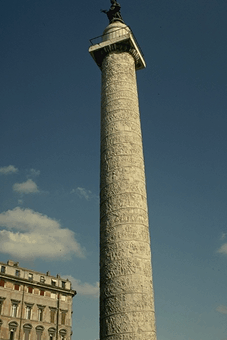 Det bedst bevarede monument er Trajans søjle (Colonna Traiano), som blev rejst i år 113 efter krigen med de genstridige Daciere, en stamme som levede i Rumænien. (Under et besøg i Rumænien i 1975 erfarede vi, at det rumænske sprog er latinsk, og at fx læger taler italiensk snarere end engelsk og tysk). Søjlen består af 18 stykker græsk marmor med mere en 2.500 figurer i forskellige kampscener. Oprindelig var søjlen forgyldt, og figurerne malet i klare farver. På toppen var anbragt en statue af kejser Trajan. Den er på et tidspunkt erstattet med en statue af Sct Peter. Søjlen har en indvendig trappe og en udsigtsplatform, men så vidt vi kunne se, kan disse muligheder ikke benyttes af tilfældige turister. Fra det nærliggende Latinske og Græske Biblioteks taghaver. Imponerende tegneserie beskrivelse af en stor kejsers bedrifter. Trajans aske opbevares i en gravurne af guld i søjlens bsis. Hvis man vil studere søjlen i detaljer skal der på Museo della Civiltà Romana i EUR befinde sig en kopi, hvor hele monumentet er 'rettet ud'. Det skal vi se næste gang.