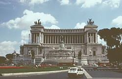 Vi spadserede den korte vej ned til den nok mest trafikerede plads i Rom, Piazza Venezia. Her, midt i Rom, ligger et - efter vores opfattelse - uhyrligt arkitektonisk misfoster: Monumento Vittorio Emanuele II. Det er bygget 1885-1911 til minde om Italiens første konge, Vittorio Emanuele, som forenede Italien. Udført i kridhvid marmor fra Brescia og med sine store terrasser i flere plan er det ikke mærkeligt, at folkeviddet har døbt det bryllupskagen. Andre kalder det skrivemaskinen. Andre benævner det - med lidt mere patos - fædrelandets alter eller nationens offer. Et bjerg af marmor, et orgie af trapper og søjler, vingede sejrsgudinder bag fyrige firspand i fed bronze. Tom Kristensen omtaler det i sin dejlige rejseskildring af Rom som "gebisset i en gammel mands mund". Det værste er ikke engang monumentet, men den manglende respekt for omgivelserne.