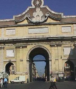 Og nu var vi tilbage på Piazza del Popolo, som vi jo tidligere havde besøgt. Jeg vil fortælle om en begivenhed, som henrykkede hele den katolske verden i 1655. Den svenske dronning Kristina abdicerede og konverterede til katolicismen. Dette var så meget mere velkommen for pavestaten, da hendes far havde været en ivrig forkæmper for reformationen. Kristina ville tage ophold i Rom, og hun skulle selvfølgelig have en modtagelse, som var en (tidligere) dronning værdig. Paven Alexander VII forfattede egenhændigt en passende inskription, som blev sat op over byporten - Porta del Popolo, hvorigennem Kristina ville ankomme: "En lykkelig og velsignet ankomst". Bernini blev bedt om at tage sig af udsmykningen af porten, som på det tidspunkt har været betydeligt mere imponerende end i dag. Bernini kom i tanker om 2 statuer af Peter og Paulus, som paven havde bestilt hos kunstneren Mochi, men da paven ikke brød sig om resultatet, var statuerne aldrig blevet leveret. Bernini kontaktede enken og statuerne af Roms største katolske skikkelser blev sat op foran porten. Statuerne er desværre taget ned igen pga. forureningen, men kan beses på bymuseet. Efter modtagelsen af den samlede magistrat blev Christina ført til officiel modtagelse i Peterskirken. Ellers var den smukke plads et inferno af trafik, så vi havde nok stemt vores forventninger lidt for højt til netop denne plet i Rom.