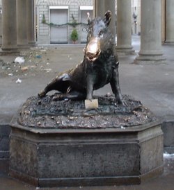 Den sidste aften i Firenze skulle vi hen og tage afsked med "Porcellino", som står på "Mercato Nuevo". "Porcellino" er en broncefigur af et vildsvin (1612), lavet af Pietro Tacca (1557-1640). Samme Tacca har også lavet den smukke fontæne på "Piazza della Santissima Annunziata", som du har set, hvis du har været med på vores tur. Vildsvinet ("Il Cinghiale") er lavet på grundlag af en marmorstatue, som i dag befinder sig på Uffizierne. Dette dyr er igen en kopi af en antik græsk marmorstatue, som desværre er gået tabt. Det har været foreslået, at vildsvinet oprindelig var en del af en større jagtscene, og vi ser vildsvinet i færd med at vågne efter at være blevet forstyrret af et jagtselskab.