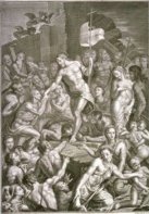 Det ene Skue fortrængte det andet, kun eet Billede fæstede sig ret i Tanken, og meest ved de glade, lykkelige Børn, som vare derpaa, den Lille havde engang i Daglys nikket til dem. Mange vandre vist dette Billede let forbi, og dog omslutter det en Skat af Poesie: det er Christus, som stiger ned i Underverdenen, men det er ei de Piinte, man seer om ham, nei, det er Hedningerne; Florentineren Angiolo Bronzino har malet dette Billede; meest herligt er Udtrykket af Børnenes Vished om, at de skulle i Himlen; to Smaa omfavne allerede hinanden, een Lille rækker Haanden til en Anden nedenfor og peger paa sig selv, som om han sagde: "Jeg skal i Himlen!" alle Ældre staae uvisse, haabende, eller bøie sig ydmygt bedende for den Herre Jesus. Paa dette Billede saae Drengen længer end paa noget andet; Metalsvinet hvilte stille foran det; et sagte Suk blev hørt; kom det fra Billedet eller fra Dyrets Bryst? Drengen løftede Haanden ud mod de smilende Børn; - da jog Dyret afsted med ham, afsted gjennem den aabne Forsal. "Tak og Velsignelse, du deilige Dyr!" sagde den lille Dreng og klappede Metalsvinet, der bums! sprang ned ad Trappen med ham. "Tak og Velsignelse selv!" sagde Metalsvinet, "jeg har hjulpet Dig og Du har hjulpet mig, thi kun med et uskyldigt Barn paa min Ryg faaer jeg Kræfter til at løbe! ja seer Du, jeg tør endogsaa gaae ind under Straalen af Lampen foran Madonnabilledet. Jeg kan bære Dig hen overalt, kun ikke ind i Kirken! men udenfor den, naar Du er hos mig, kan jeg see ind ad den aabne Dør! stig ikke ned af min Ryg, gjør Du det, da ligger jeg død, som Du seer mig om Dagen være det i Gaden Porta Rossa!" "Jeg bliver hos Dig, mit velsignede Dyr!" sagde den Lille, og saa gik det i susende Flugt gjennem Florents's Gader, ud til Pladsen foran Kirken Santa Croce.