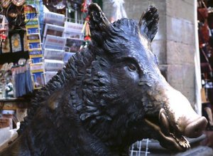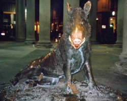 Henne i Hertugens Slotshave [Giardino di Boboli ved Palazzo Pitti], under Pinjens Tag, hvor tusinde Roser blomstre ved Vintertid, havde en lille, pjaltet Dreng siddet den hele Dag, en Dreng, der kunde være Billedet paa Italien, saa smuk, saa leende og dog saa lidende; han var sulten og tørstig,, Ingen gav ham en Skilling, og da det blev mørkt og Haven skulde lukkes, jog Portneren ham bort. Længe stod han drømmende paa Broen over Floden Arno [Ponte della Trinitá, som blev ødelagt under 2. verdenskrig] og saae paa Stjernerne, der blinkede i Vandet mellem ham og den prægtige Marmorbro. Han tog Veien hen til Metalsvinet, knælede halv ned, slog sine Arme om dets Hals, satte sin lille Mund til dets skinnende Tryne og drak i store Drag det friske Vand. Tæt ved laae nogle Salatblade og et Par Kastanier, det blev hans Aftensmad. Der var ikke et Menneske paa Gaden; han var ganske ene, han satte sig paa Metalsvinets Ryg lænede sig forover, saa hans lille, lokkede Hoved hvilte paa Dyrets, og før han selv vidste det, sov han ind.