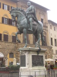 Det var Midnat, Metalsvinet rørte sig, han hørte, at det sagde ganske tydeligt: "du lille Dreng, hold Dig fast, thi nu løber jeg!" og saa løb det med ham; det var et løierligt Ridt. - Først kom de paa Piazza del Granduca [Piazza della Signoria]; og Metalhesten, som bar Hertugens Statue [Giovanni di Bolognas rytterstatue af storhertug Cosimo I de Medici], vrinskede høit; de brogede Vaaben paa det gamle Raadhuus skinnede som transparente Billeder, og Michel Angelos David svingede sin Slynge; det var et selsomt Liv, som rørte sig! Metalgrupperne med Perseus [Benvenuto Cellinis "Perseus med Medusas hoved"] og med Sabinerindernes Rov [Giovanni di Bolognas "Sabinerindernes Rov"] stode kun altfor levende; et Døds-Skrig fra dem gik over den prægtige, eensomme Plads.