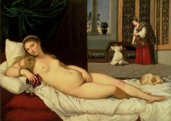 Fordoblet viste sig Billedet af Venus, den jordiske Venus, saa svulmende og ildfuld, som Titian havde seet hende [Titians "Venus af Urbino"]. To deilige Qvinders Billeder; de skjønne, ubeslørede Lemmer strakte sig paa de bløde Hynder, Brystet hævede sig og Hovedet bevægede sig, saa at de rige Lokker faldt ned om de runde Skuldre, medens de mørke Øine udtalte glødende Tanker; men ingen af alle Billederne vovede dog at træde heelt ud af Rammen. Skjønheds-Gudinden selv, Gladiatorerne og Sliberen bleve paa deres Plads, thi Glorien, som straalede fra Madonna, Jesus og Johannes, bandt dem. De hellige Billeder vare ikke Billeder længer, de vare de Hellige selv. Hvilken Glands og hvilken Skjønhed fra Sal til Sal! og den Lille saae dem Alle; Metalsvinet gik jo Skridt for Skridt gjennem al den Pragt og Herlighed.