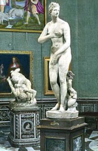 De traadte ind i et langt Gallerie, han kjendte det godt, han havde været her før; Væggene prangede med Malerier, her stode Statuer og Buster, alle i det skjønneste Lys, ligesom om det var Dag, men prægtigst var det, da Døren til et af Sideværelserne gik op; ja denne Herlighed her huskede den Lille; dog i denne Nat var Alt i sin skjønneste Glands. Her stod en nøgen, deilig Qvinde, saa smuk, som kun Naturen og Marmorets største Mester kunde forme hende; hun bevægede de smukke Lemmer, Delphiner sprang ved hendes Fod, Udødelighed lyste ud af hendes Øie. Verden kalder hende den medicæiske Venus. Paa hver Side af hende prangede Marmorstatuer, deilige Mænd; den ene hvæssede Sværdet, Sliberen kaldes han; de brydende Gladiatorer udgjorde den anden Gruppe; Sværdet hvæssedes, Kæmperne brødes for Skjønheds-Gudinden. Drengen var som blendet af al den Glands; Væggene straalede i Farver, og Alt var Liv og Bevægelse der.