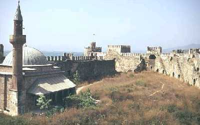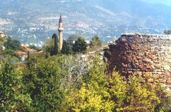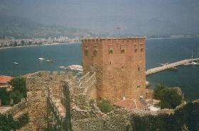 Nu synes jeg, at du skal følge med os op til fæstningen i Alanya. Om aftenen er den og den omkransende mur smukt oplyst med et gyldent skær. Grundstenen til fæstningen skal være lagt af piraten Diototos Tryphon i det andet århundrede før Kristus. Disse pirater, som bl.a. ernærede sig ved kidnapning af prominente borgeres døtre, var stedse en tori i øjet på romerne. Stedet forblev centrum for piraterne, som hærgede hele sydkysten, indtil Pompejus mere end 100 år senere med hård hånd rensede den østlige ende af Middelhavet for sørøvere. I 1226-1232 blev fæstningen indtaget af den seldjukkiske sultan, Alaeddin Keykubat (1200-1237). Alaeddin havde allerede 10 år forinden gjort byen til sin vinterresidens samt flådehavn for den daværende hovedstad, Konya. Byen døbte han Alaiye - "Ala's by". I øvrigt havde seldjukerne store problemer med at indtage fæstningen og blav gang på gang slået tilbage. Sagnet fortæller, at sultan Keykubat fik en lys idé. Han indfangede flere hundrede vilde geder og bandt et tændt lys i hornene på dem. Da forsvarerne så de mange angribere vælte op ad klipperne, overgav de sig straks. Historien er næppe sand, men god. Det synes jeg, er tilstrækkelig grund til at fortælle den. Håber, du er enig. I den seldjukiske periode blev fæstningen genopbygget og udvidet betydeligt. I 1472 blev byen inkluderet i det ottomanske rige under Mehmet II (erobreren). I 1935 under Atatürks første besøg i byen fik den navnet Alanya.