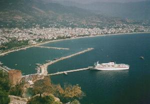 Nu har jeg tænkt mig at fortælle lidt om feriebyen Alanya. Som tidligere nævnt ligger Alanya ca 2 timers kørsel øst for Antalya, hvor de fleste charterfly lander. På lang afstand får man øje på byens vartegn, fæstningen højt oppe på det forbjerg, som stikker ud i havet. På begge sider af halvøen ligger kilometerlange sandstrande, tæt bebygget med hoteller. Byen ligger smukt ved foden af de smukke Taurus bjerge. Det vides ikke med sikkerhed, hvornår Alanya er grundlagt, men den har i tidens løb været underlagt romerne, byzantinerne, armenerne og andet godtfolk. Sikkert skulle det være, at piraten Diototus Tryphon byggede en fæstning på toppen af forbjerget omkring 200 BC - mere herom senere.