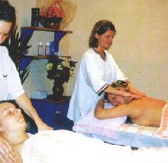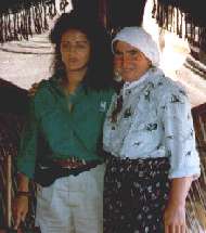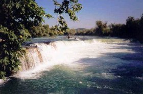 En dag besluttede vi at tage med en offentlig bus til Manavgat. Busserne afgår med ca 15 minutters afstand fra busholdepladsen ved markedet. Turen, som tog godt 1 time, kostede 15 kroner - men så gjaldt den også kun den ene vej. Efter at have nydt en øl ved floden købte vi billet til en sejltur ud til det vandfald, der ligger lidt nord for. Undervejs så vi en del fugleliv og også en mængde små flodskildpadder. Der er også gode mulighede for at nyde lidt solen undervejs, hvilket Birgit og Bo gør på dette billede fra uturen i 1990. Da vi efter ca 20 minutters sejlads nåede frem, steg vi over i en minibus, som bragte os de sidste 3 kilometer til vandfaldet.