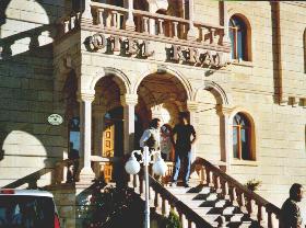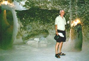Hen under aften kom vi frem til Hotel Kral i Ürgüp, hvor vi skulle tilbringe de følgende 2 nætter. Jeg tror, at vi alle blev behageligt overraskede, da vi så hotellet. Værten fortalte senere på aftenen, at hotellet både var bygget med "gamle materialer" - dvs kalksandsten - men også efter gammel byggestil. Han erklærede stolt, at der ikke fandtes andre hoteller i Tyrkiet i denne stil. Det vrimlede med tjenstvillige tjenere, så snart var vi indkvarteret på vores værelser. På billedet til højre står vores unge guide og snakker med den meget venlige overtjener.
