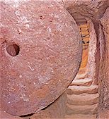 Gangene mellem de forskellige etager er ca 40 meter lange og nogle steder kun 1 meter i diameter. Der var jo ingen grund til at gøre det alt for let for en evt. indtrængende fjende. Gangene kan ikke anbefales til personer med tendens til klaustrofobi. I mange tilfælde var flere underjordiske beboelser forbundet med gange. I det mindste var der lavet et lille hul i væggen, så man kunne kommunikere med naboerne. På billedet ser vi Erling vende tilbage fra et besøg i dybet.