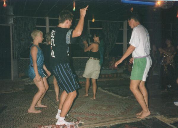 Efter nogen tid dukkede en folkedansertrup op og underholdt os en halv times tid, enden den igen forsvandt - formentlig til næste arrangement. Vi fik øl og vin på bordet. I begyndelsen kun øl, men da køleskabet ikke kunne følge med vores samlede tørst - og de leverede øl blev varmere og varmere - gik vi over til vin. Vi bemærkede dog, at alle de lokale tilsyneladende drak te. Herefter dukkede en mavedanser op, og det lykkedes hende at få hele teltet mobiliseret. Og snart dansede vi - og vores unger - rundt og havde det dejligt. Især Kurt, som er en letpåvirkelig sjæl, havde en stor aften sammen med den dejlige mavedanser. Da vi dødtrætte kørte tilbage, måtte ungerne "indrømme", at de aldrig havde haft det så sjovt på et dansk diskotek.