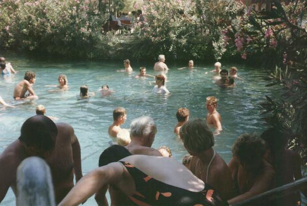 Og sidst på eftermiddagen var vi fremme ved vores hotel, som lå for foden af bjerget op til Pamukkale. Det var et udmærket mindre hotel med en dejlig swimming pool, som vi straks indviede. Som du kan tænke dig, er der varmt i det indre Tyrkiet i juli måned. Luksushoteller befinder sig inde på selve området, men vi var glade for på afstand at kunne beundre de mere end 100 meter høje og kridhvide bjergskråninger, som fører op til området.