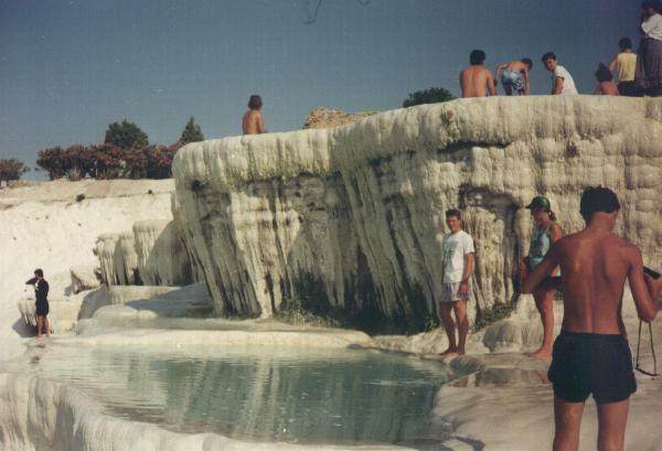 Og endelig sidst på eftermiddagen ved 18-tiden kom vi hen til det, vi primært var kommet for at se. Nemlig de utroligt smukke bassiner, som naturen har dannet. Varmt, mineralholdigt vand fra 17 varme kilder har gennem tusinder af år rislet ned over klipperne. I første omgang har der aflejret sig en geleagtig masse i de små øvrste bassiner. Over tiden er dette materiale hærdet og er blevet til såkaldte travertiner. Vi blev alle overraskede over, at det var så behageligt at gå på og slet ikke glat, som vi havde forventet. Knægtene skulle selvfølgelig ud ud og ligge og boble i de yderste bassiner, ganske tæt ved en 100 meter skrænt ned til dalen.