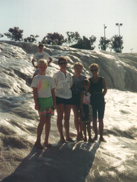 Vi kunne næsten ikke rive os løs fra de fantastiske bassiner. Det var efterhånden blevet sidst på eftermiddagen, og vi nød den synkende sol over Pamukkale. Her er Claus (i baggrunden) stillet op til fotografering sammen med Bo, Bente, Karin samt vores guides søster og hendes datter. Idyllisk, ikke?