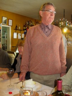 Inden spisningen bragte sognepræst Mads-Bjørn Jørgensen Kirsten (afgående organist i kirken, tror jeg) en varm tak for mange års arbejde for kirken og uddelte også et par flasker vin, som blev vel modtaget. I sin lille tale referede han til Wessels "lille vakre Kirsten Bak" - uden at trække sammenligningen for langt. Efter spisningen talte Birgit med Mads-Bjørn Jørgensen. Du ved, hvis man ikke spørger, får man ikke noget at vide. Gået på klingen fortalte han, at han gået på pension i 2005. Hans seneste ansættelse var sognepræst ved Sct. Andreas Kirke i København. Hustruen, Anna-Marie, som er læreruddanet, havde de seneste 30 år været viceskoleinspektør på Den Classenske Legatskole i København. Mads (ja, det går hurtigt med at komme på fornavn med mennesker her i Spanien) fortalte, at han i august 2006 tiltrådte en 3-årig tjeneste som præst for Den danske Kirke i Schweiz med bopæl i Genève og yderligere menigheder i Bern, Basel og Zürich. Det svarede lidt til, at man i Danmark skulle prædike i hhv. Ålborg, Haderslev, Odense og København. Han og hustruen havde tre gode år dernede. Han tiltrådte i Den danske Kirke øst for Malaga i november 2011, og han og hustruen håbede på mange gode år hernede. Både Mads og Marie, som i øvrigt fyldte 70 år dagen efter, så ud til at være i god form både åndeligt og fysisk, så det er der al mulig grund til at tro, at det ønske skal gå i opfyldelse. Det ville også glæde menigheden, som tydeligvis var glad for præsteparret. Marie, som var med til gudstjenesten og efterfølgende spisning, fortalte, at også hun befandt sig rigtig godt hernede. De tilbragte forår og sommer i Danmark og kørte selv til Costa del Sol, når "kirkeåret" begyndte i begyndelsen af november. Herre gud, det er jo bare en køretur på 3.000 km.