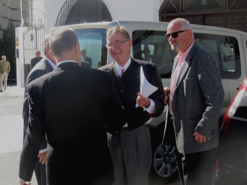 Den 7. februar 2014 kørte vi til Fiskerkapellet i strålende solskin. Vi kom allerede kl. 11. Skønt ceremonien først skulle finde sted kl. 13, var der allerede livlig aktivitet. Vi gik en tur og vendte tilbage kl. 12:30, og da var der dukket flere gæster op. Blandt disse til vores glæde 4-banden fra Stevns. Snart dukkede brudgommen op - meget passende iført tyrefægterkostume.