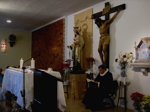 Der var et pænt fremmøde, dvs. godt 50 personer. Det skal tilføjes, at en del af kirkegængerne allerede var taget tilbage til det danske forår (i 2013 vil det sige frost og sne). I anledning af den snarligt kommende påske var de store figurer af hhv. "Jesus bærende på korset" og "Jomfru Maria" stillet frem på de "flåder", hvorpå de bæres rundt i byen under påskeprocessionerne. Til daglig befinder de sig i hver deres niche på hver side af koret.
