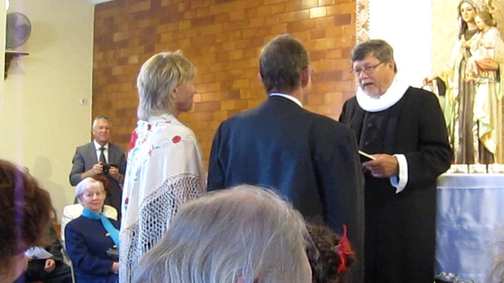 Du husker måske, at vi i vinteren 2013 havde truffet Inger Marie og Bent. De var mødtes og sød musik var opstået. De strålede af lykke, så ingen kunne undgå at se det og kunne ikke gå uden at holde I hånd. "Det sødeste kærestepar vi mødte under hele vores ophold". Da vi skiltes fra dem efter afskedsgudstjenesten i Frigiliana, erklærede de, at når de var kommet hjem til Danmark, ville de finde et sted at bo, blive gift og flytte sammen. Birgit og jeg havde talt om det meget forelskede par adskillige gange siden dengang og var spændte på at erfare, om de spændende planer var blevet til virkelighed. Vi ankom til Nerja den 7. januar, og første gang, vi kom hen i klubben i Almunecar, så vi på opslagstavlen en indbydelse til at deltage i den kirkelige velsignelse af Inger Marie og Bents ægteskab den 7. februar 2014. Vi så på hinanden og smilede – og skrev os straks på listen. Under fællesspisningen efter gudstjenesten den 18. januar rejste Bent sig op og fortalte, at han og Inger Marie var blevet borgerligt gift i sommeren 2013, havde købt hus på Sydsjælland (Inger Marie har været organist i en årrække i Store Heddinge Kirke) og var flyttet sammen. Nu ville de gerne have deres bryllup velsignet af kirken, og det skulle selvfølgelig ske her, hvor de havde mødt hinanden, og selvfølgelig skulle Mads-Bjørn forestå velsignelsen. Bent inviterede alle, som ville glæde dem på dagen, til at deltage i ceremonien og den efterfølgende fest. I stedet for at give brudeparret en gave skulle man i stedet betale for festmiddagen på restauranten. Hvem kunne sige nej til sådan et tilbud?