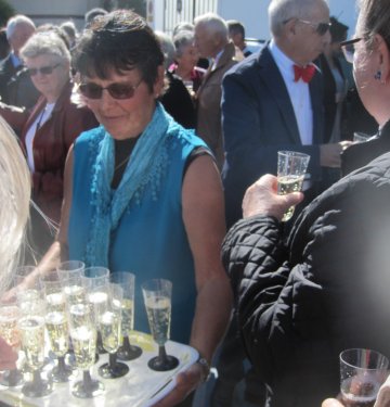 Til venstre ses brudeparret. Til højre serverer den altid hjælpsomme Merete champagne for gæsterne.