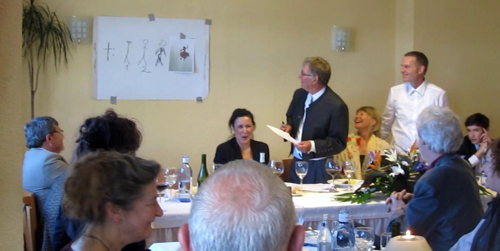 Stephen underholdt med et par numre fra Tryllefløjten, og en af Bents gode venner, Hasse, fortalte den spændende historie om, hvorledes Bent havde kapret Inger Maria lige foran næsen på ham. Men, som min mor altid sagde: "Man skal spise, når maden står på bordet". Per Maimann, som har været kirkesanger ved "domkirken" i Store Heddinge - heraf flere år i samarbejde med Inger Marie - underholdt med et par dejlige viser. Utroligt at så fin en tenor har holdt til så mange cigaretter. Simon, som i 2009 tog afsked med sin menighed i Store Heddinge efter 35 år som sognepræst og 25 år som provst, foredrog et par lystige viser med sin prægtige bas. Barnebarnet var også oppe og give endnu et nummer. Herudover var der adskillige taler fra familiemedlemmer og venner, Merete holdt en meget sjov og personlig tale til brudeparret.