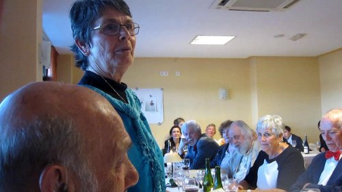 Efter at have sunget et par sange blev der serveret "stegt flæsk med persillesovs". Jeg er nærmest født op med den slags føde - hvilket stadig kan ses på min flotte krop - men jeg var spændt på, hvad vores engelske venner ville mene om kosten. Den faldt i god jord, og Ian fortalte, at den mindede meget om den kost, som han fik om vinteren i sin barndom i Newcastle i Nordengland. Under vores talrige fælles søndagsmiddage var vi blevet klar over, at englændere - i hvert fald vores englændere - sætter særdeles meget pris på dessert, og citronfromagen, som præstefruen Marie havde lavet, forsvandt som dug for solen. Mads fortalte, at han havde haft travlt med at slikke skåle, og måske havde han også taget et kilo på, siden vi så ham sidst. Efter middagen var der en konkurrence, hvor deltagerne skulle svare på fem spørgsmål. Mads forestod dette på sin sædvanlige humoristiske facon og læste op af Guldhornene, Storm P, Benny Andersen m.fl. for at lede os frem til svarene. Jeg tror, at alle kunne besvare de fem spørgsmål korrekt, men det vigtigste var, at vi havde det vældig sjovt undervejs.