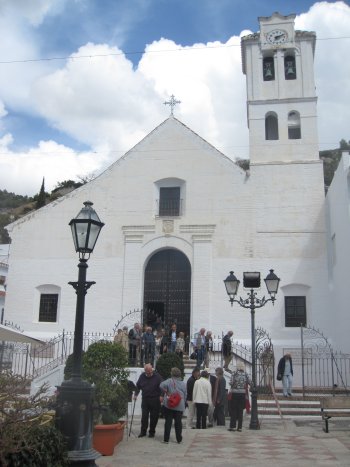 Lørdag den 23. marts 2013 var vi til den afsluttende gudstjeneste i Den danske Kirke øst for Malaga. Traditionen tro fandt den sted i sognekirken i Frigiliana, Iglesia de San Antonio de Padua. San Antonio er sømændenes, fiskernes og de rejsendes beskytter - det må vel også omfatte turister som os, går jeg lidt optimistisk ud fra. Kirken blev bygget i 1676 på ruinerne af en moske; byggeriet blev bekostet af familien Manrique de Lara, og bygmester var Bernardo de Godoy, som var "hofarkitekt" for biskoppen af Malaga. Klokketårnet er den oprindelige minaret fra moskeen, og en stor del af facaden, bortset fra indgangsdøren, er også i maurisk stil. Den smukke, indre trædør til kirken er udført af Bartolomé de la Cruz, som boede i Frigiliana det meste af livet. Han blev en anerkendt træskærer og har produceret mange af de træfigurer, som anvendes i forbindelse med de religiøse processioner i Andalusien.