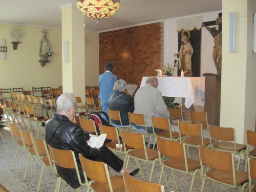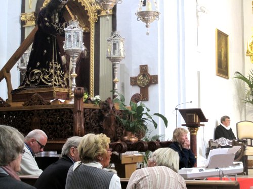 Bag det lille alter var en smuk figur af Kristus på korset, og til venstre en figur af Jomfru Maria med sønnen på armen. Der var flere udsmykninger i kirkerummet, som viste dets katolske oprindelse. Efterhånden dukkede der flere kirkegængere op, og til sidst var vi omkring 35. Faktisk så mange, at beholdningen af salmebøger ikke slog til. Bortset fra en enkelt, måske en datter, som var på besøg, var vi alle i pensionsalderen. De fleste hilste på hinanden, og da præsten kom, gik han også en runde og hilste. Før gudstjenesten begyndte, rejste et medlem af menighedsrådet sig op og spurgte hvor mange, der ville med til fællesspisning bagefter. Det viste sig, at der er fællesspisning efter hver gudstjeneste. Hele 31 meldte sig. Og så skulle vi også vælge mellem to forretter (spaghetti med ost eller bønner med Serranoskinke) og mellem fisk (dorado) eller mørbrad til hovedret. Herefter ringede optællersken til restauranten og oplyste tallene, så de kunne gå i gang med at tilberede menuen. Lidt pudsigt efter dansk sædvane, men meget livsbekræftende, og det fælles måltid er jo et vigtig ritual indenfor den kristne kirke. Gudstjenesten forløb helt efter dansk tradition, og der blev sunget kraftigt med på de 5-6 salmer. Præsten holdt en fin tale om "de betroede talenter", og gudstjenesten afsluttedes med altergang.
