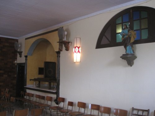 Der var kun kommet et par mennesker før os, men da døren stod åben, gik vi indenfor, hvor vi blev hilst hjerteligt velkommen af formentlig kirketjeneren. Menigheden er ikke større, end at alle kender hinanden, så når der er nye (måske skulle jeg hellere sige ukendte?) ansigter, skal man selvfølgelig lige forvisse sig om, hvem de er, og hvor de kommer fra. Vi så os omkring i kirkerummet, inden vi satte os på de opstillede klapstole. Et par, som kom samtidig med os, var åbenbart erfarne kirkegængere, da de havde medbragt et par hynder.
