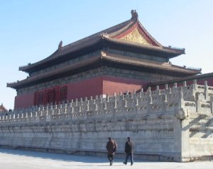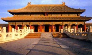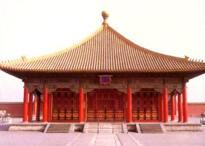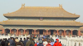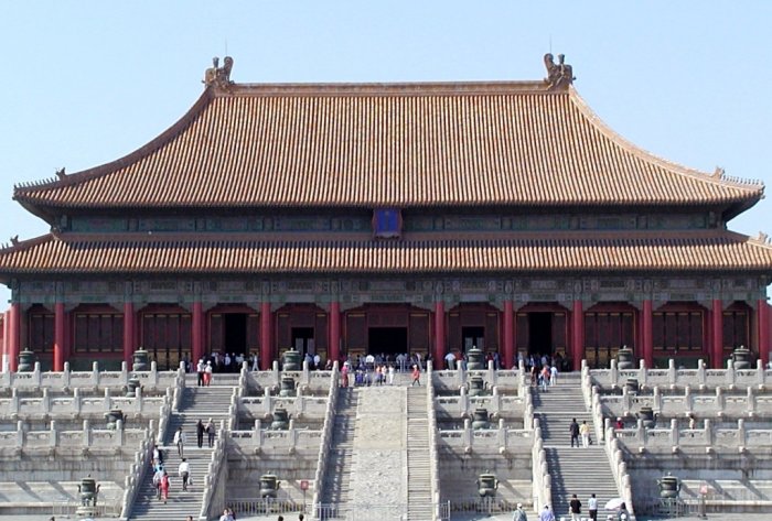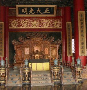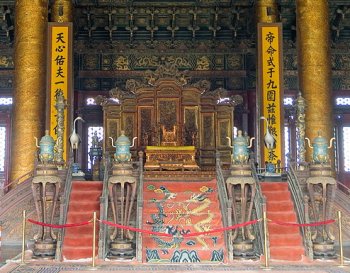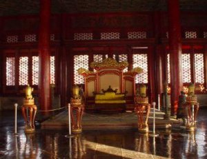 I midten af den store sal står den forgyldte tronstol af sandeltræ, dragetronen, hvorfra kejseren regerede. Som det fremgår af billedet, er der også tre trapper op til tronen. Den midterste trappe var forbeholdt kejseren, mens embedsmænd og tjenestefolk og andre dødelige måtte tage til takke med de to øvrige. Over tronen fra det smukke forgyldte kasseloft med masser af dragemotiver hænger en kæmpemæssig sølvskinnende perle, kaldet "Xuanyuan". Denne perle var efter sigende i stand til at skelne mellem godt og ondt, sandt og falsk. Det fortælles, at Yuan Shikai, som udnævnte sig selv til kejser i 1916, efter at den sidste kejser var blevet tvunget til at abdicere, flyttede perlen, så den ikke længere hang lige over tronen. Selv om ingen af os jo tror på den slags overtro, er der jo ingen grund til at udfordre skæbnen.