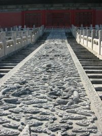 Som vi allerede har set, vrimler det med drager i Beijing, både i Den Forbudte By og udenfor. Disse drager var meget forskellige og kunne bestå af dele af et rådyr, en fisk, en tiger, en løve, en hest, en okse, et æsel, en slange og en ørn - og sikkert meget andet. Dragen kan gå på land, svømme i havet og flyve i luften. Den er gud over vinden og regnen. I modsætning til den traditionelle vestlige opfattelse ser kineserne dragen som et venligt og beskyttende dyr. På dette billede ses en af de mange trapper med udhuggede dragemotiver. Dragens opgave var at beskytte slottet eller templet.