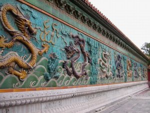 På vej tilbage mod den sydlige udgang passerede vi den berømte "Ni dragers mur", en af de største og flotteste af slagsen i Kina. Den er bygget i 1771 under kejser Qianlong. Den er 3½ meter høj og 31 meter lang og består af 270 glasserede farvestrålende kakler. Motivet er ni drager, som leger med perler på en baggrund af hav og skyer. Antallet af drager (ni) er vigtigt og symboliserer kejserens magt. På siderne af monumentet er afbildet fem drager. Tallet fem er også vigtigt, da det er det midterste af cifrene 1-9, på samme måde som kejseren befinder sig mellem jorden og himlen.