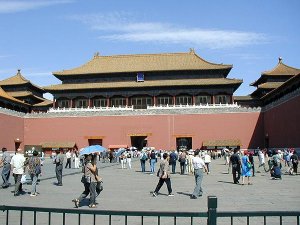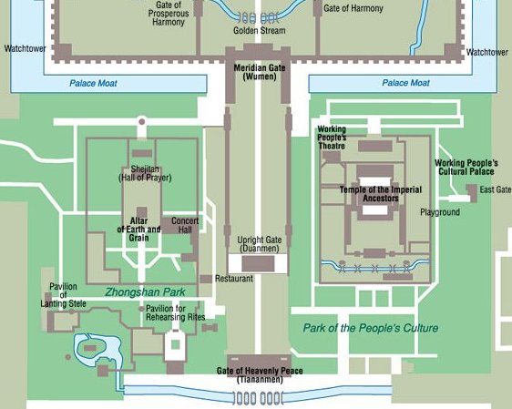 Som du kan se, var der en spændende udsigt fra Den Himmelske Freds Port over Den Himmelske Freds Plads med Maos Mausoleum i baggrunden. Nedenfor er vist et kort over Den Himmelske Freds Port og den forreste del af Den Forbudte by.