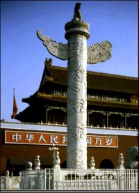I forbindelse med Den Himmelske Freds Port finder vi de såkaldte "huabiao", som er et par 10 meter høje smukt dekorerede marmorsøjler. Øverst på hver søjle står en løvelignende figur ("hou") med blikket rettet opad. Der findes et par søjler foran Den Himmelske Freds Port og et andet par indenfor porten. Disse mytiske figur holdt øje med, hvad kejseren foretog sig, både når han var udenfor paladset, og når han var hjemme. Hvis kejseren ikke vendte tilbage i rette tid, ville "hou'erne" på de ydre søjler advare ham og sige "Deres majestæt, De bør ikke bruge så megen tid på at more dem. Skynd Dem tilbage og tag vare på landets anliggender. Vi har næsten slidt vores øjne op, mens vi har ventet på Deres hjemkomst!". "Hou'erne" indenfor i slotsgården holdt øje med, hvad kejseren bedrev, når han var på paladset. Hvis han brugte for megen tid på sig selv og for lidt tid på sine pligter, ville "hou'erne" advare ham og fortælle, at det var på tide, at han gik ud blandt folket. Det var måske en ide at få sådan en par søjler sat op ved Christiansborg ;-).